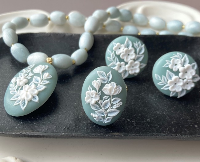 白く浮かび上がる植物柄は、職人がひと針ひと針手仕事で描いた繊細なレリーフ細工。陰影が生み出す静謐な美しさが目を惹きます。下書きや型を使用しない独自技術による一点物です。