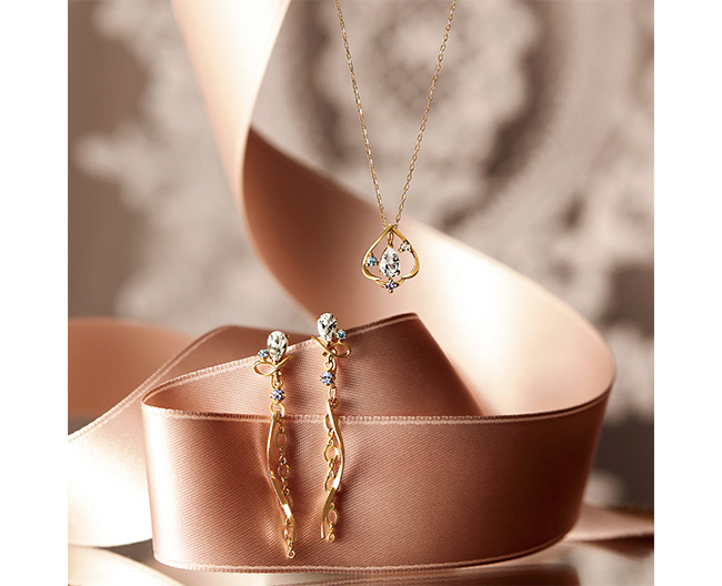 三大ウィンナ・ワルツ「美しく青きドナウ」を舞踏会で踊る様子をイメージしたピアス・ネックレス。