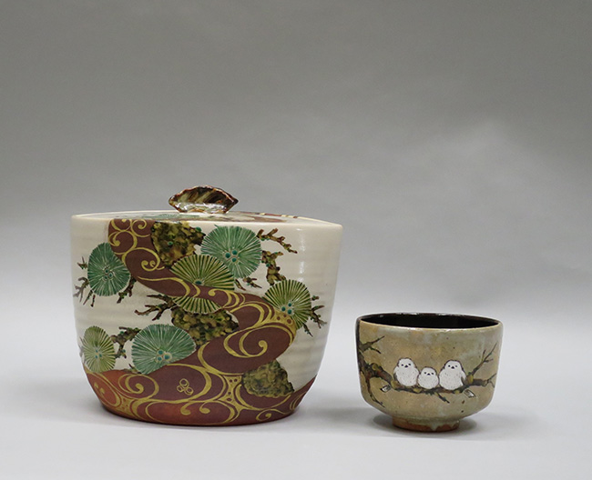 左:中村秋峰 光琳水唐松絵水指 右:中村良二 灰釉掛分しまえなが絵茶碗