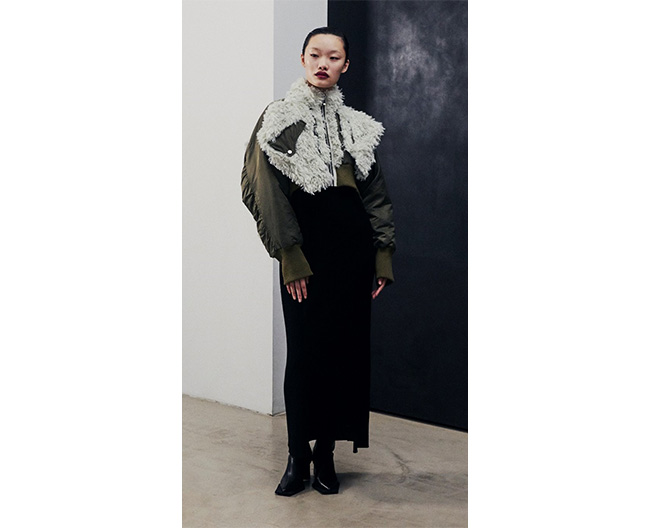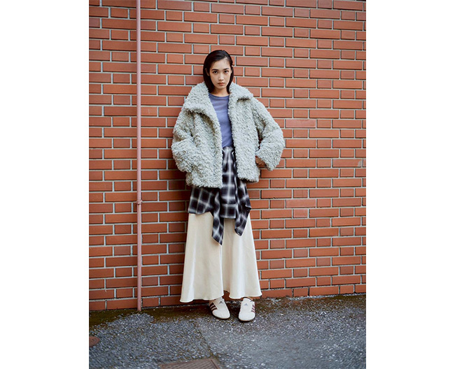 ボア(ファー)を使用したボリューム感が目を引くMA-1ドッキングブルゾン。ショート丈なので、シンプルなワンピースやコンパクトなスタイリングに合わせるのがポイントです。