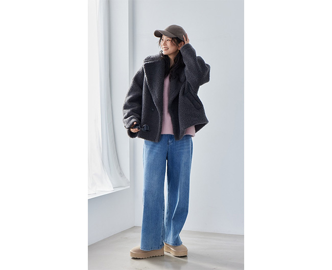 クルクルと巻いたプードルのようなモコモコの毛並みがトレンド感あふれるコート。ゆとりある身幅と、ドロップした肩、大きめの袖付のリラックスしたサイズ感が特徴です。