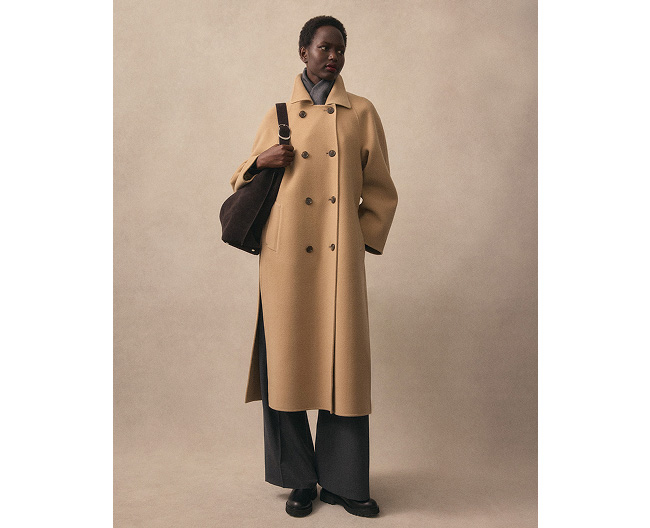 カシミヤをブレンドした、軽やかでソフトな肌触り。クリーンなデザインで腰位置から深く入ったサイドスリットがアクセントのダブルブレストロングコート。
