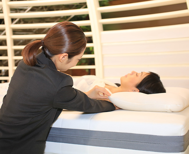 お客様の睡眠環境やお悩みごとを丁寧にカウンセリングし、実際にベッドで枕を体感いただきながら、数ある枕の中からお客様にあった枕をご提案いたします。