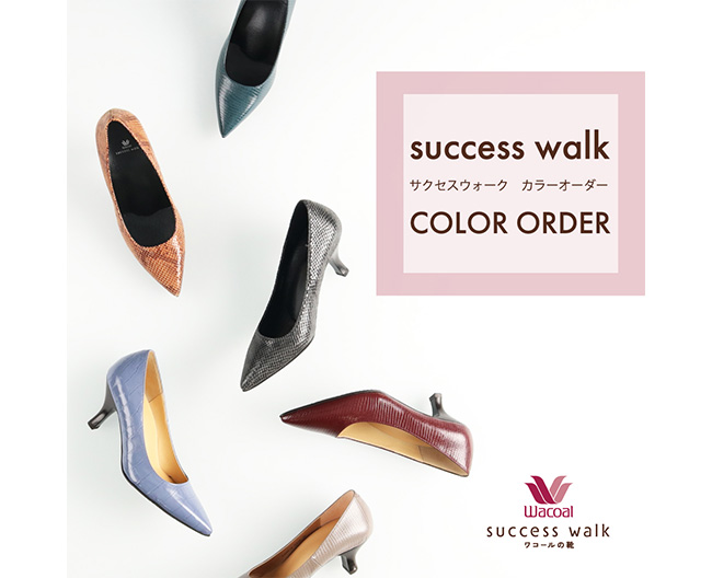 美しさと機能性を兼ね備えたシューズブランド[ワコール サクセスウォーク]よりカラーオーダーを開催いたします。トゥ・ヒール高・カラーなどを選んで、自分だけのオリジナルパンプスをお作りいたします。