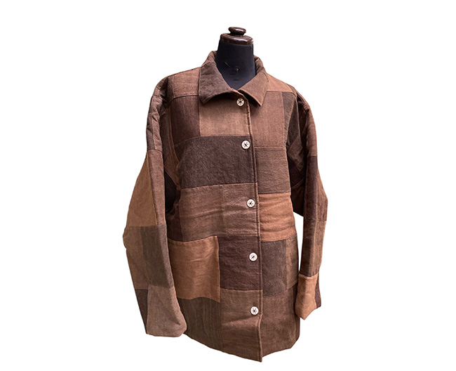 様々な色に染めた柿渋染めの布をパッチワークして、綿を入れた軽くて温かなコートです。