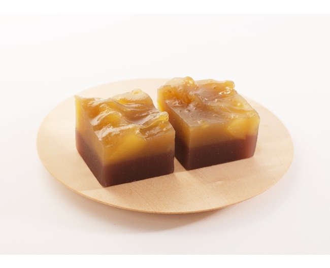 栗の甘露煮を入れた栗羊羹と北海道産小豆のこし餡羊羹を重ねました。
