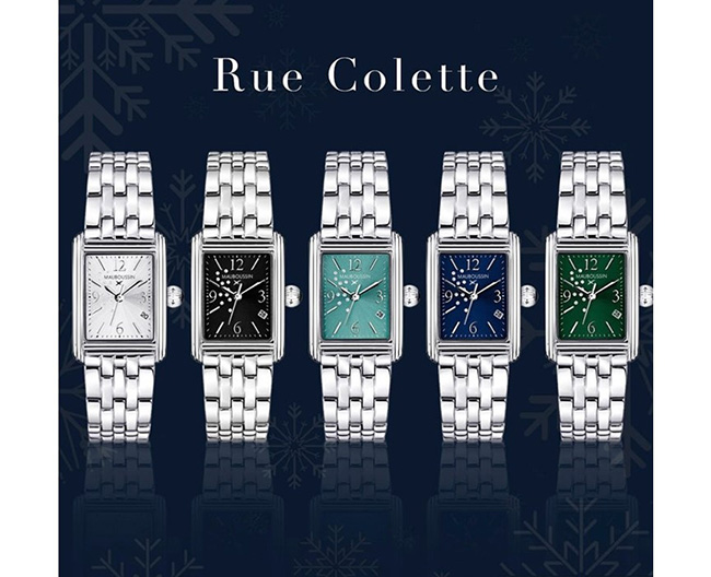 パリのシックを手元に。パリ、コレット通りを行き交うパリジェンヌに着想を得たカラーとフォルムで魅せるシックなウォッチ。個性が光る長方形のケースに、11石のダイヤモンドが、まるで星が瞬くように時に流れに輝きを添えます。SNSでたびたび話題となり、品薄が続いていた人気モデルが待望の再入荷。ダイヤルカラーはシルバー、ブラック、ターコイズ、ナイトブルー、グリーンの5色展開。