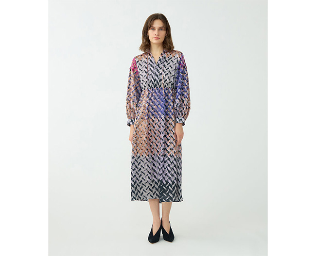 上品な光沢をもった糸で織り上げたしなやかな素材に、プリズムのような神秘的な光をイメージしたプリントを施したシリーズ。グラデーションのような大きなパネル柄を贅沢に使用し、柄の出方までこだわった一着。