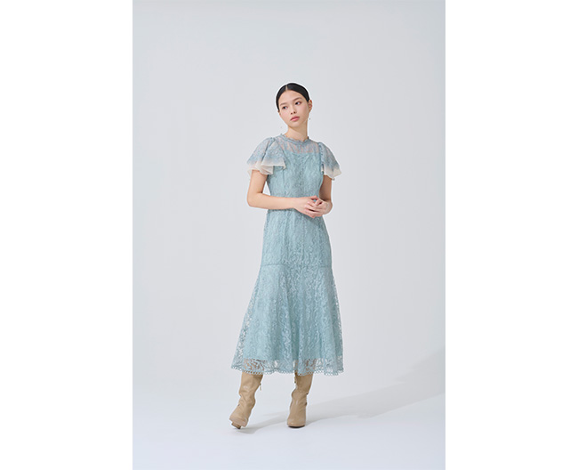 繊細なレース生地を使用したマーメイドドレス。袖のラッフルは、ドレッシーなボリュームを加えつつ、華やかさと抜け感を両立。