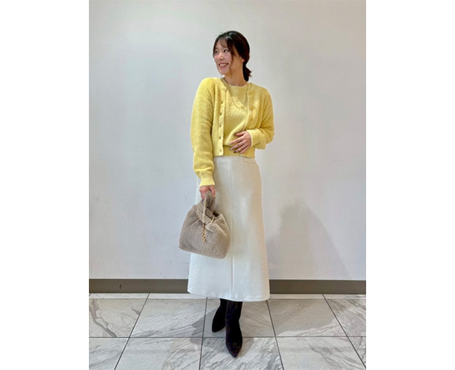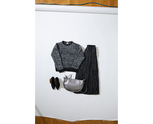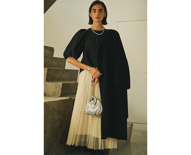 特別なディナーに映える、バルーンスリーブが印象的なトップスと、柔らかな落ち感が魅力のミディスカートで、エレガントなひとときを演出するスタイル。