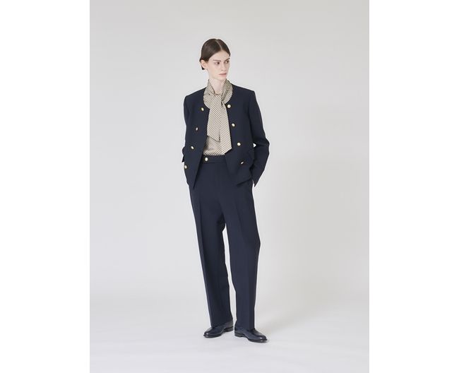 メンズライクなスタイリングでもボウタイブラウスで女性らしさを演出。