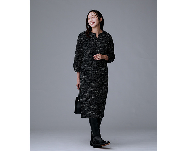 ウォーム感ありながらもカジュアルすぎないスタイリングのワンピース。