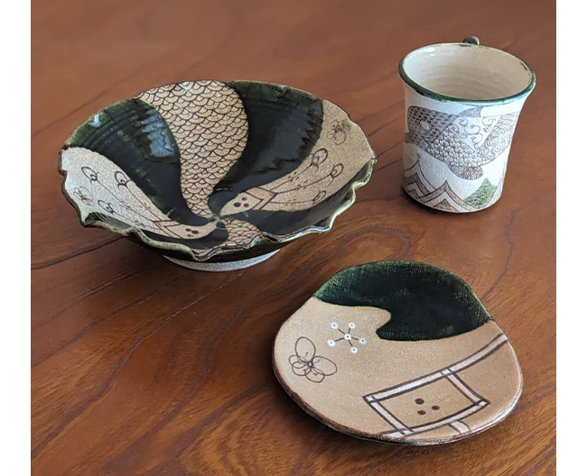 日本六古窯(ろっこよう)のひとつ、[赤津焼]は瀬戸焼の源流である国指定の伝統的工芸品。七釉の「灰釉」「鉄釉」「古瀬戸釉」「黄瀬戸釉」「志野釉」「織部釉」「御深井釉」を用いて千年を超える伝統が今なお続いています。七釉の代表的な「織部釉」の器を、日本の歴史と伝統美と共にご覧ください。