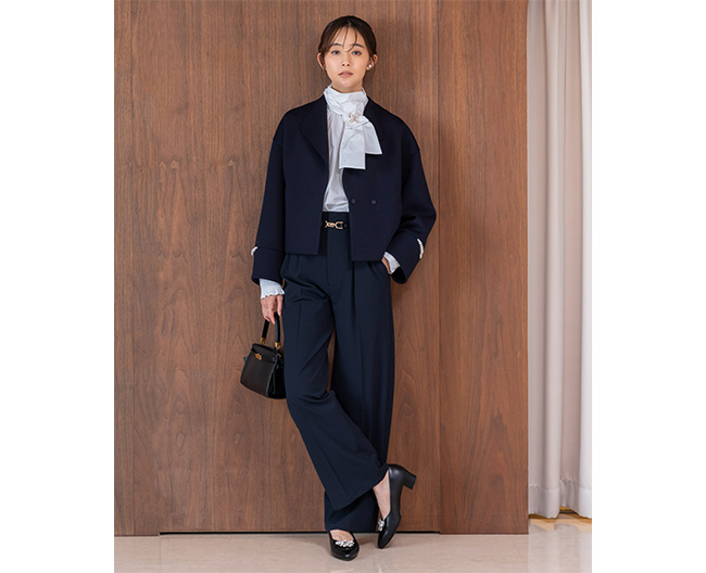 コートやジレのインナーに差し込むだけでコーディネートがパッと垢抜けるボウタイブラウス。撥水に加え、食べこぼしも弾く撥油機能付きだからお食事を伴うハレの日にもおすすめ。ボウタイは前で結んでも後ろで結んでもOKな2WAY仕様です。