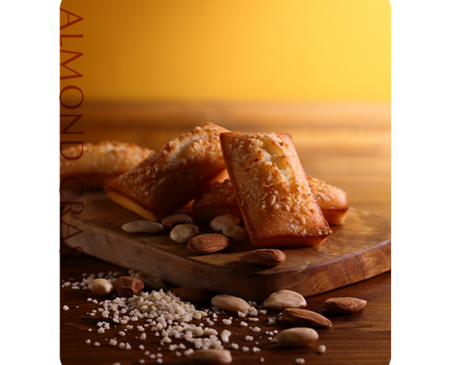 プレーン味のシチリア産アーモンドのフィナンシェにさらにシチリア産クラッシュアーモンドをトッピングしたフィナンシェ。