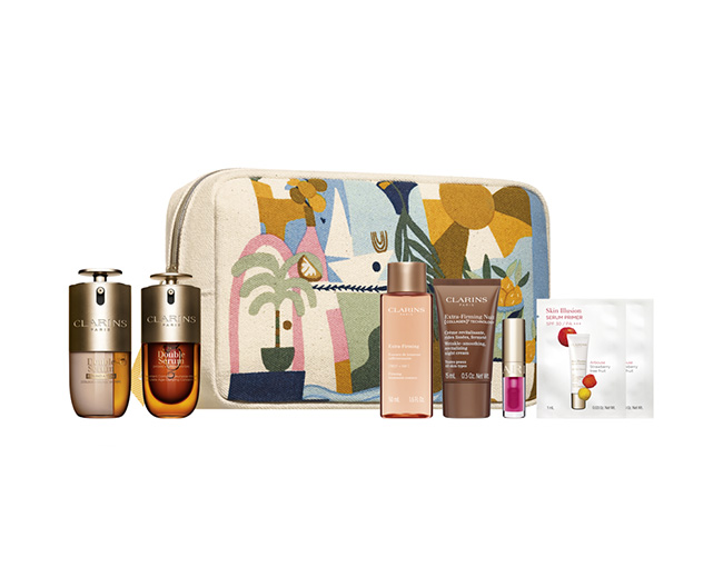 さらにエイジングケア***化粧水とクリーム、リップオイルのトライアルサイズ、セラム プライマー サシェサンプル、オリジナルポーチもついたイベント限定セットで、[クラランス]のスキンケアからメイクアップまで存分にご堪能いただけます。