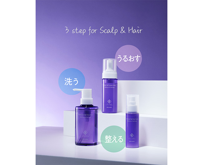 洗顔後のお顔を丁寧にケアするように、年齢とともに変化する”頭皮”にも保湿ケアを。「洗う・うるおす・整える」の3ステップでかなえる新ヘアケアラインです。ご来店のお客様には、「トリートメントヴェイル シャンプー」&「トリートメントヴェイル ヘアクリーム」のサンプルをご用意しております。