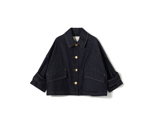 微光沢のある素材と、メタルの附属品をゴールドにして、上品さとカジュアルさを両立したアウターに仕上がっています。