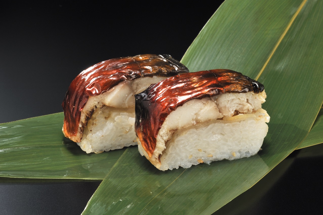 脂ののった鯖をじっくり秘伝のタレで漬け込み、香ばしく焼き上げました。胡麻シャリとの間の甘酢生姜がさっぱり感を出しています。