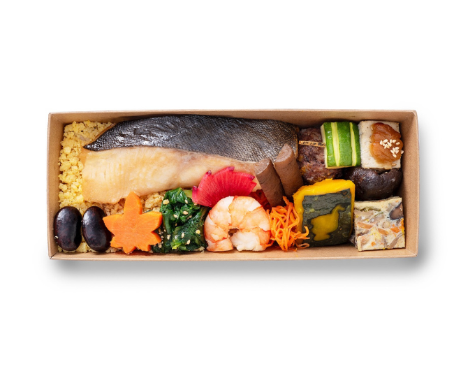 大ぶりで脂ののった銀だらと和のおかずを詰め込んだ食べ応えあるお弁当です。銀だらはふんわりと味噌の風味をまとった上品な味わいに仕上げました。