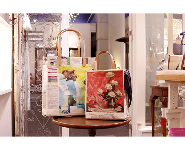 本物のヨーロッパの新聞や1960年代のファッション雑誌などをそのままプラスチックコーティングして世界にひとつだけのバッグやお財布を仕立てている[A-griffe(アグリ)] の春先におすすめのトートバッグとショルダー付きトートバッグをご案内いたします。