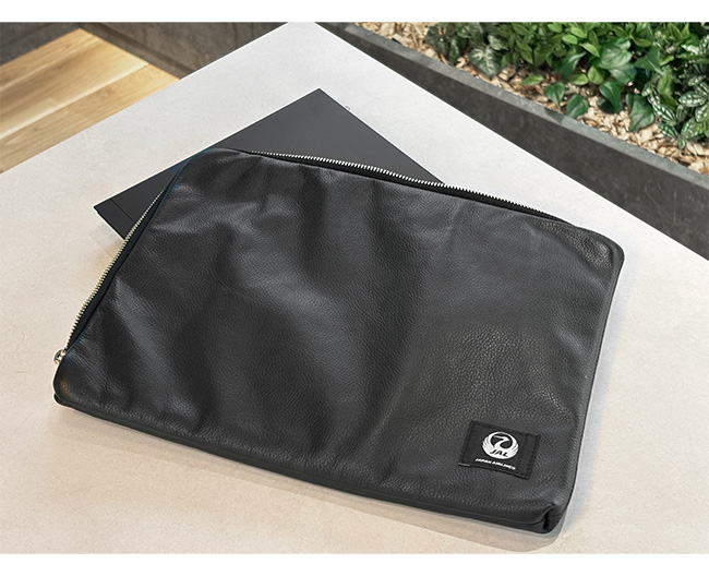 航空機で使われるシートレザーを再利用したPCケースです。素材はオーストリアで開発された航空機専用のレザーで、航空機の客室部品に求められる耐火性や強度があります。14 インチのPCまで収納可能です。