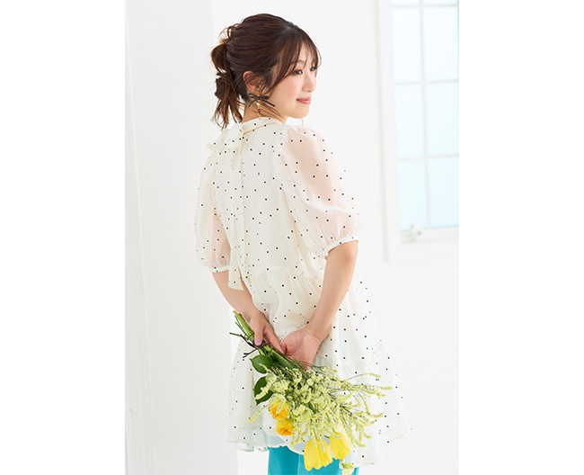 軽やかなエアリー素材に小さなハートドットが可愛らしいバックリボンのティアードブラウス。
