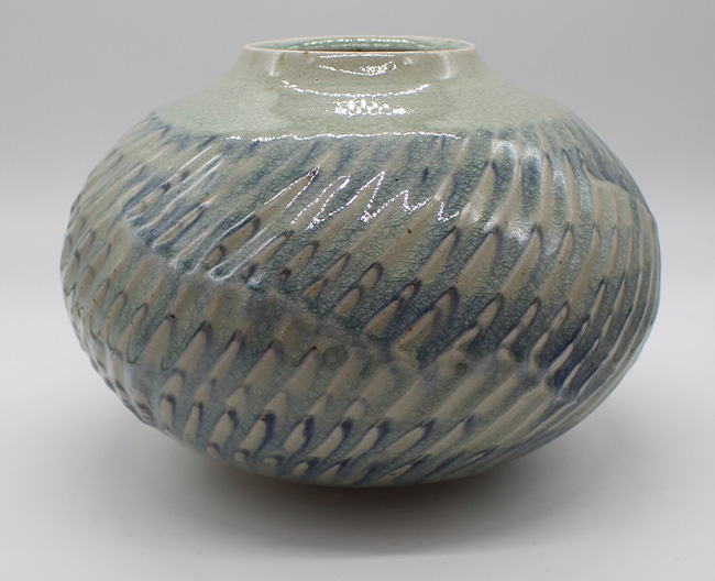 写真上)御深井削紋花器(素材:陶器 約径23×高さ16cm) 93,500円