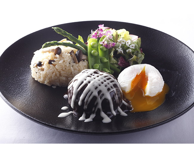 ふっくらジューシーに焼きあがったハンバーグステーキを、きのこのピラフやポーチドエッグとともにお楽しみください。