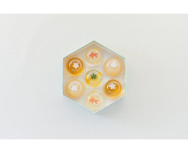 柚子、夏みかん、白桃、梅の4種類の果実を使用した、夏季限定の水菓子です。素材を活かしたシンプルな味わいと、華やかな見た目は贈りものやてみやげにおすすめ。