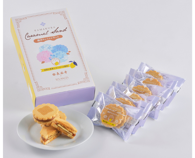 [鎌倉レ・ザンジュ]と長谷寺が初コラボレーション。神奈川県産レモンピール入り特製キャラメルとホワイトチョコレートクリームを、紫陽花のかたちのサブレでサンドしました。